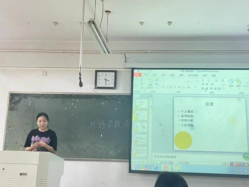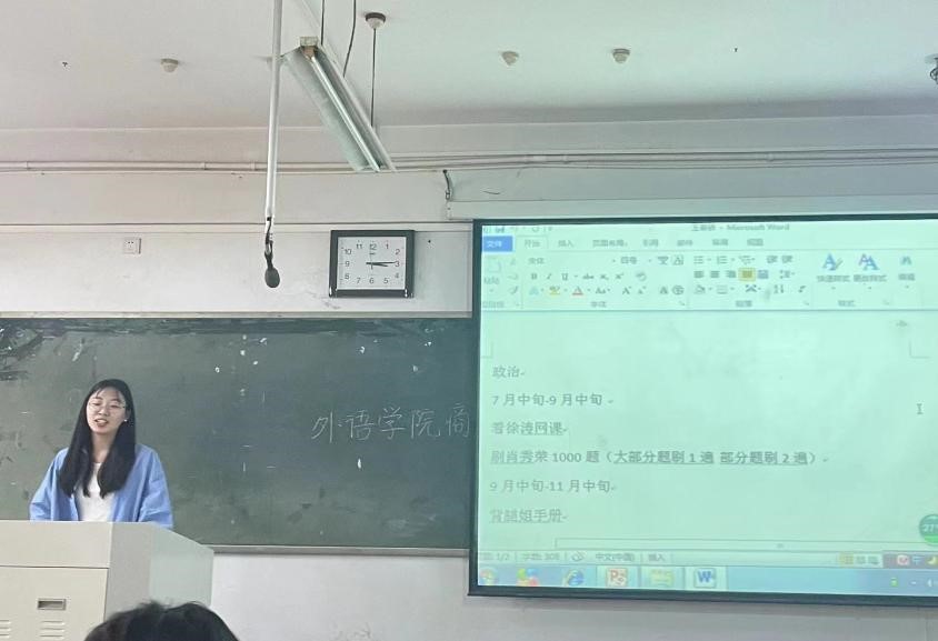 交流会上,四位同学结合自身经验,从院校选择、备考计划、学习方法和时间分配等方面做了汇报,并且和参加交流会的同学们分享了一些优秀的学习资源和公众号。在交流阶段,四位同学还和同学们面对面交流,认真回复了同学们提出的问题,并鼓励同学们要相信自己,坚持不懈,不负青春。