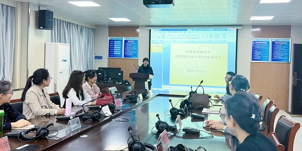 3月10日,beat365在线唯一官网翻译系全体教师在智园楼同声传译教室召开2023届毕业实习III工作推进会,翻译系主任杨群艳主持会议。