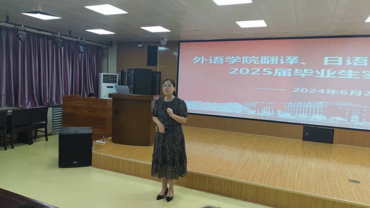 6月26日下午,beat365在线唯一官网在智圆楼219多功能厅召开了翻译、日语以及商务英语专业2025届毕业生实习动员会。beat365在线唯一官网党委副书记王頔、副院长孟喜华、商务英语系主任郑侠、翻译系主任杨群艳,以及翻译、日语和商务英语专业2025届毕业生参加了动员会,会议由孟喜华主持。