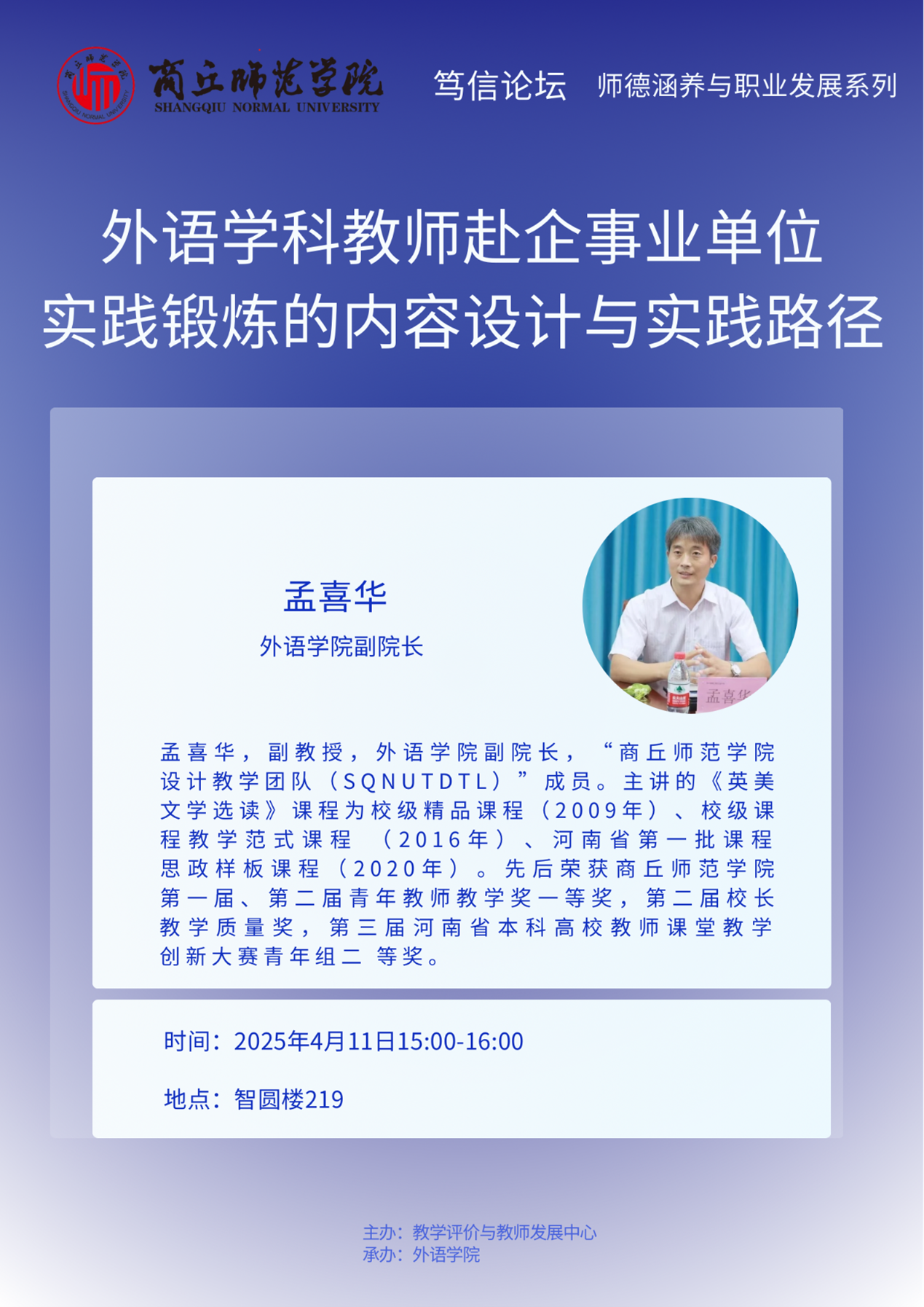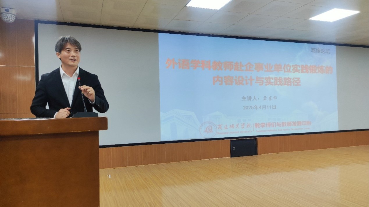 4月11日,由beat365官网教学评价与教师发展中心主办、beat365在线唯一官网承办的“笃信论坛”在beat365官网梁园校区智圆楼219多功能报告厅举行,beat365在线唯一官网副院长孟喜华作了题为《外语学科教师赴企事业单位实践锻炼的内容设计与实践路径》的专题讲座,beat365在线唯一官网全体教师参加了本次论坛。