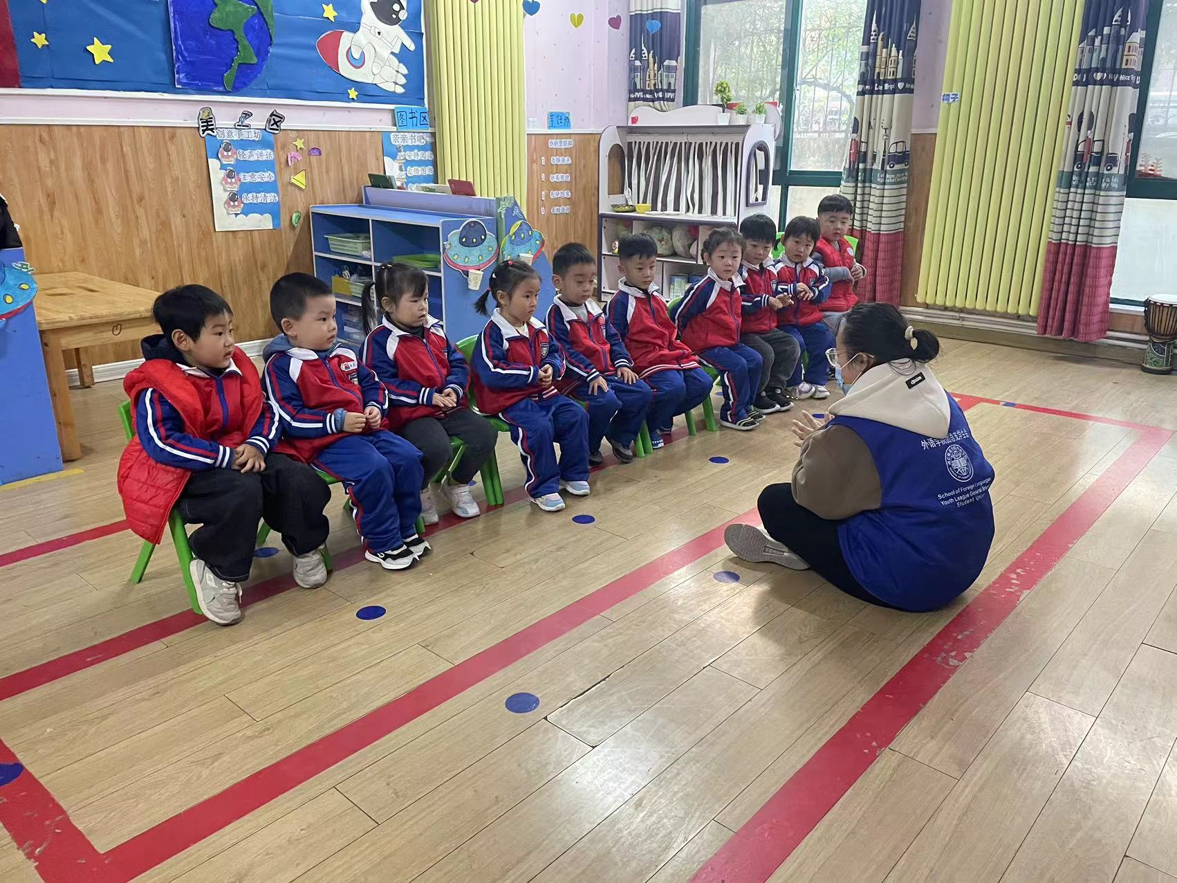 活动之前,志愿者共同探讨了本次实践活动的详细方案,准备了丰富多彩的知识小课堂和课间小游戏。活动期间,志愿者通过唱歌和小游戏等互动方式,让孩子们在轻松、欢乐的氛围中学习英语小知识。大家给孩子们讲解日常生活中常用的英语小知识,介绍了水果的英文单词和小雪节气的相关知识,教给孩子们熟悉英文字母及简单句式。