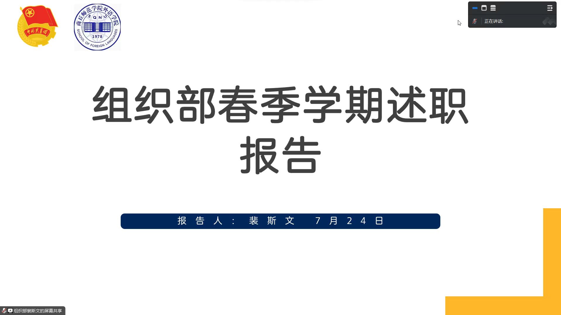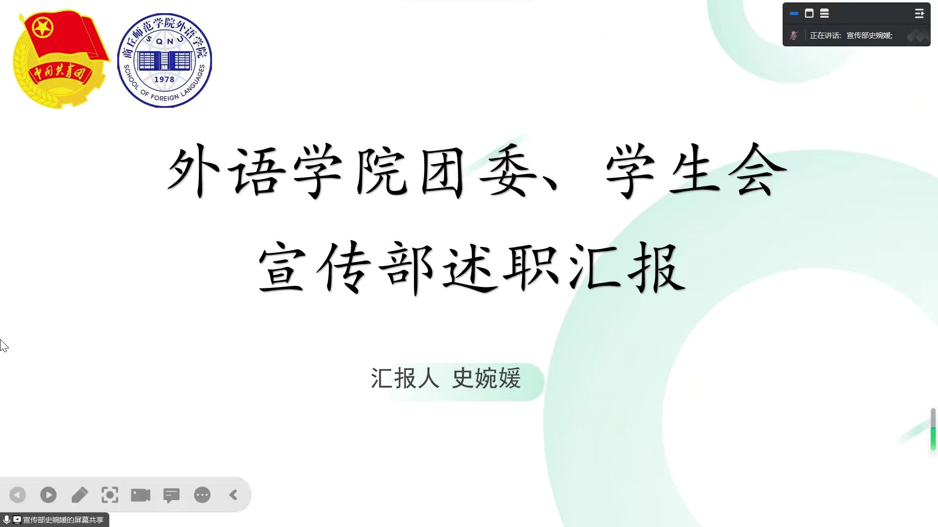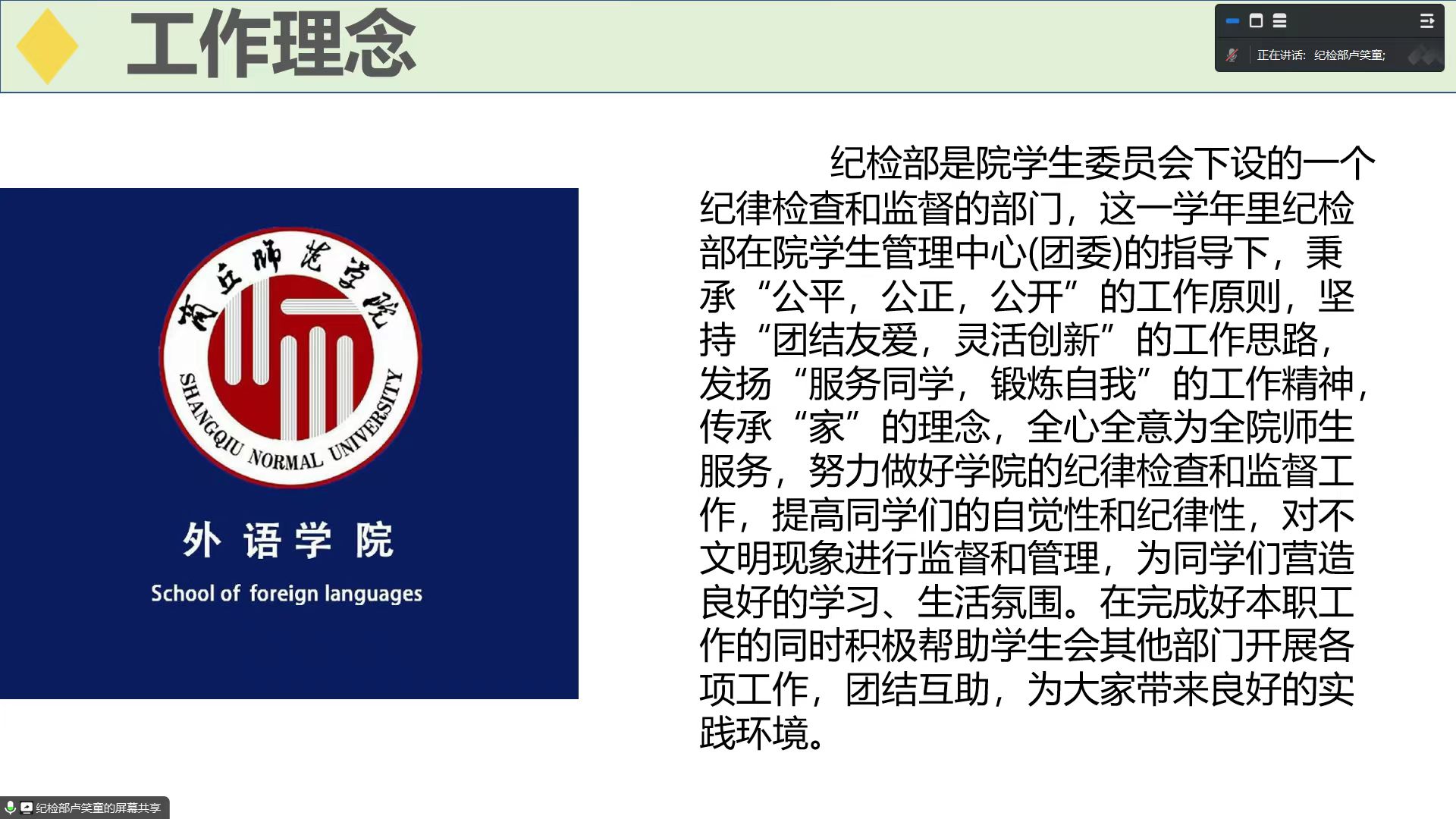 会议伊始,主席团顾雯蕾就探索学生会机构改革、开展校园文体活动等内容进行了总结,聚焦思想引领,塑造良好风气,彰显beat365在线唯一官网特色。顾雯蕾对学生会存在的问题和未来发展规划进行述职,为新学期beat365在线唯一官网学生会工作奠定基础。接着,学生会各部门代表对本学年部门工作进行总结汇报以及对工作中存在的问题进行梳理分析,并作出新学期工作的规划和安排。