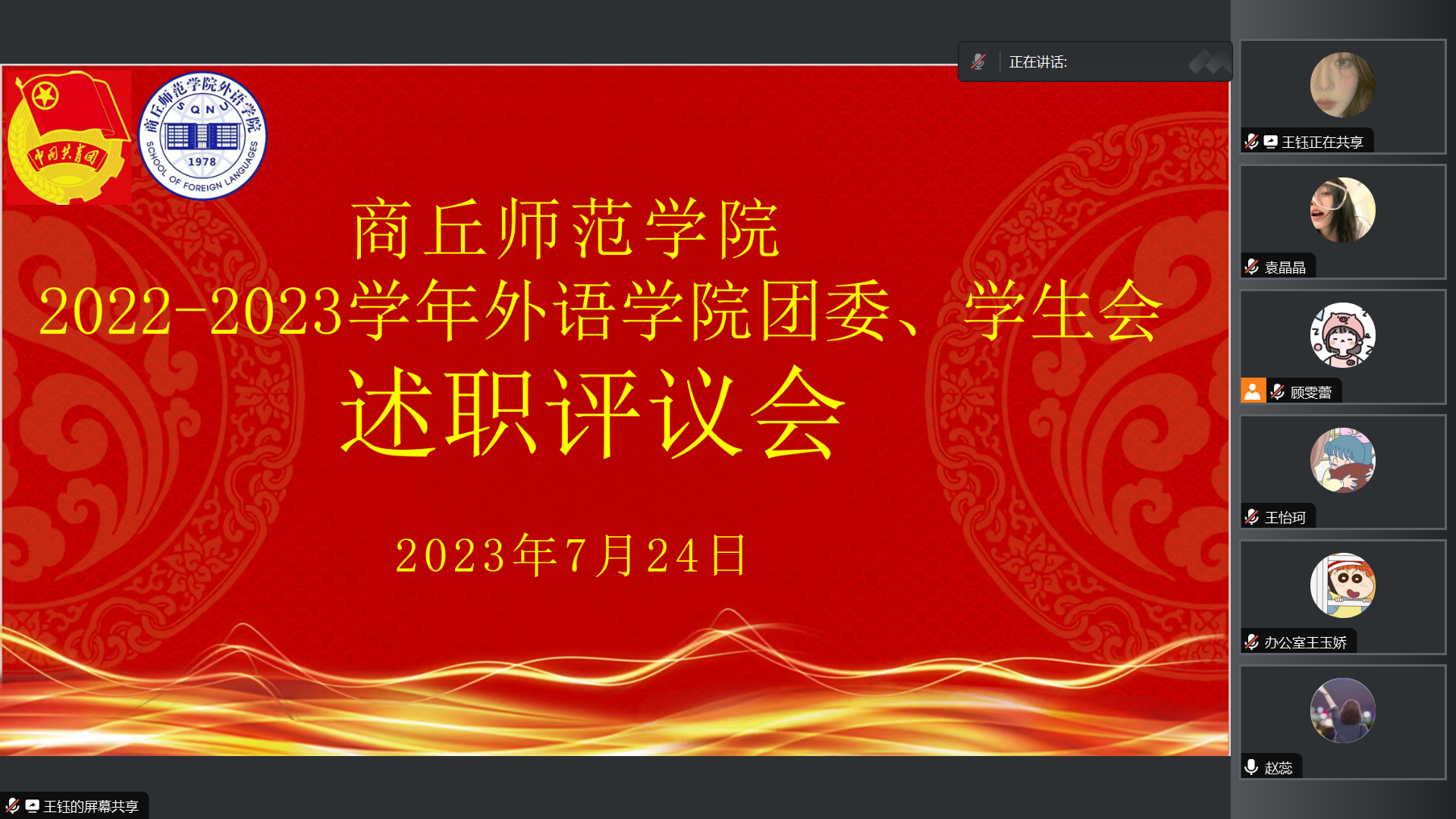 为贯彻落实《关于推动高校学生会(研究生会)深化改革的若干意见》有关要求,进一步加强对beat365在线唯一官网团委、学生会工作监督和管理,提高学生会成员的责任意识、服务意识和大局意识,beat365在线唯一官网于2023年7月24日上午通过腾讯会议召开了2022-2023学年beat365在线唯一官网团委、学生会述职评议会。参与本次会议的有beat365在线唯一官网团委书记赵蕊,学生会主席团、各部门负责人及相关成员。