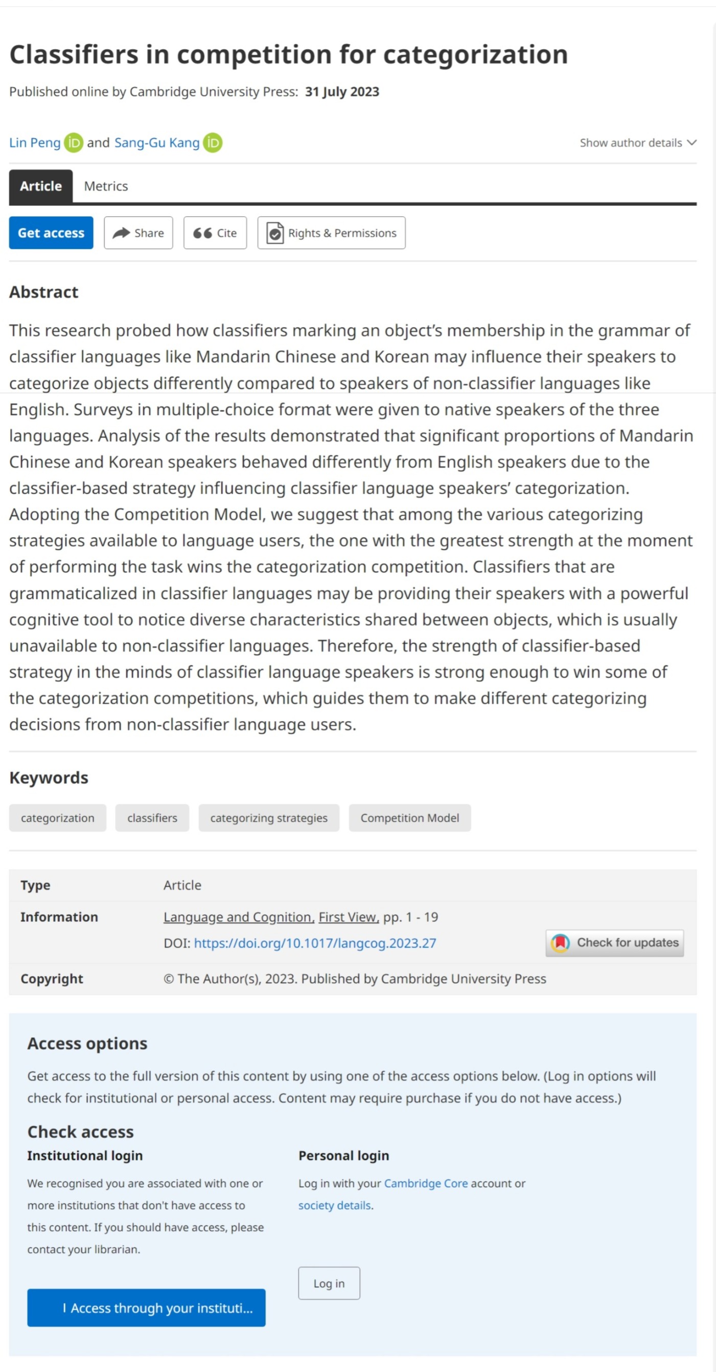 近日,beat365在线唯一官网彭琳博士以第一作者身份在国际期刊Language and Cognition上发表了题为“Classifiers in competition for categorization”的高水平学术论文。该论文基于前人研究成果,创新性地构建了中、英、韩三种语言的量词竞争模型,并采用实证研究方法,探讨了量词的结构、事物分类的形式以及量词对事物分类带来的影响等语言学因素对二语习得和母语使用者的影响。