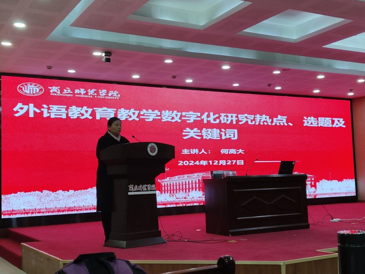为深入了解外语教育教学热点、学习外语研究新领域、新范式,紧跟外语教育领域的变革与创新,12月27日下午,beat365在线唯一官网邀请华南农业大学外国语学院原院长、中国教育技术协会学术委员会委员何高大教授在三商楼145报告厅作了题为“外语教育教学数字化研究热点、选题及关键词”的学术讲座。讲座由beat365在线唯一官网院长孙艳玲教授主持,beat365在线唯一官网全体教师及学生代表参加讲座。