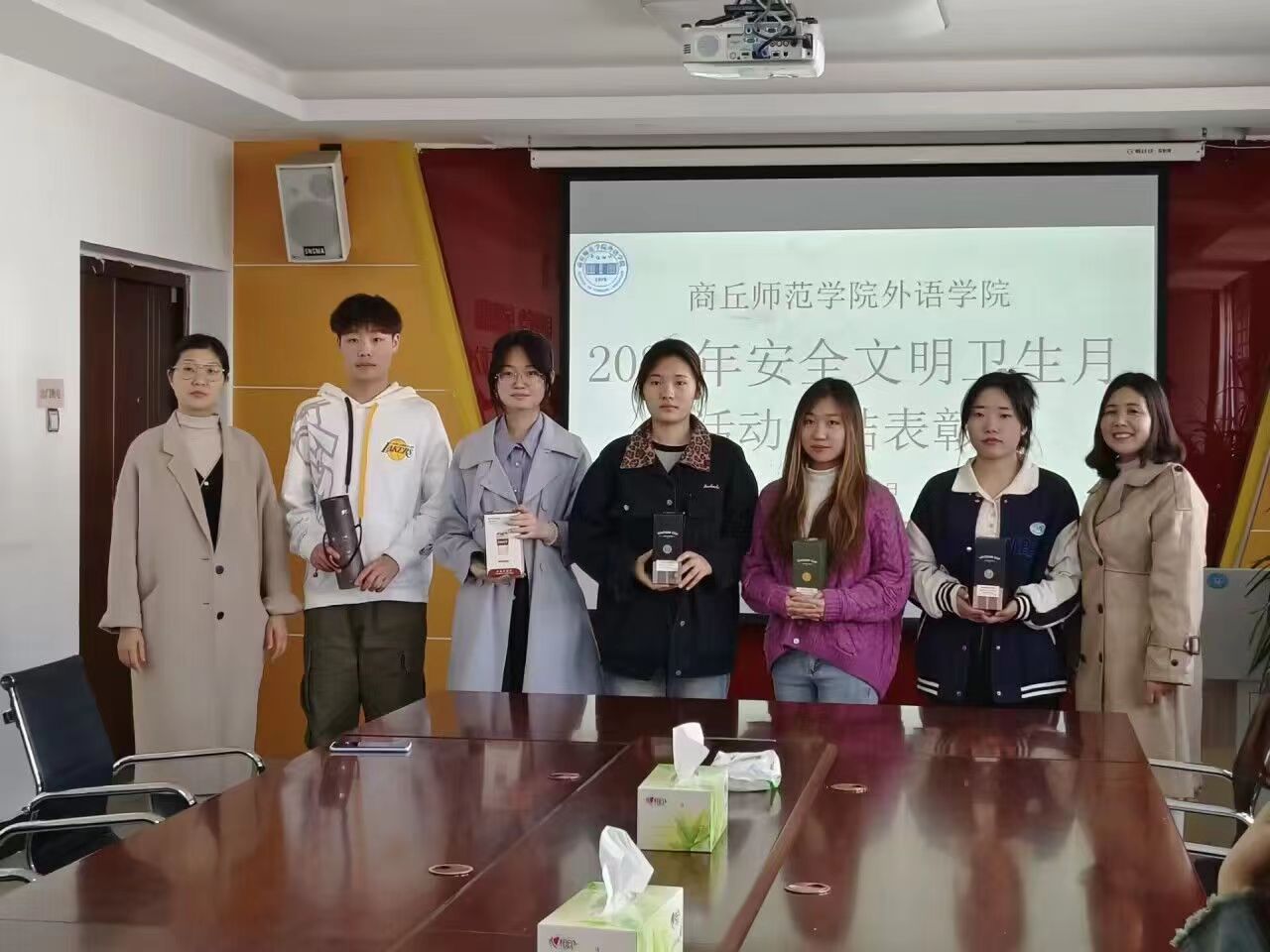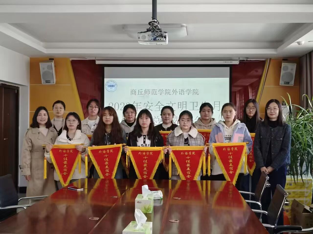 会上,赵蕊首先宣读了在“‘宿’说安全,‘寓’见美好”最美宿舍评选活动、“便利生于指尖,安全牢记心间”文明上网短视频征集活动中获奖的集体和个人。接着,与会领导老师依次为受到表彰的同学颁发了锦旗和奖品,并对他们表示祝贺。最后,王頔再次强调了开展“安全文明卫生月”活动的重要意义,希望通过树立优秀标杆宿舍,发挥模范作用,展现宿舍风采,共同创建安全、文明、高雅的校园环境。