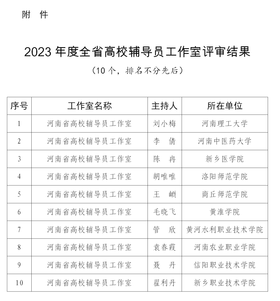 近日,中共河南省委教育工委、河南省教育厅公布《关于2023年度全省高校辅导员工作室评审结果的公示》,beat365官网党委学工部组织申报、beat365在线唯一官网党委副书记王頔主持的项目成功通过评审,获批“河南省高校辅导员工作室”。