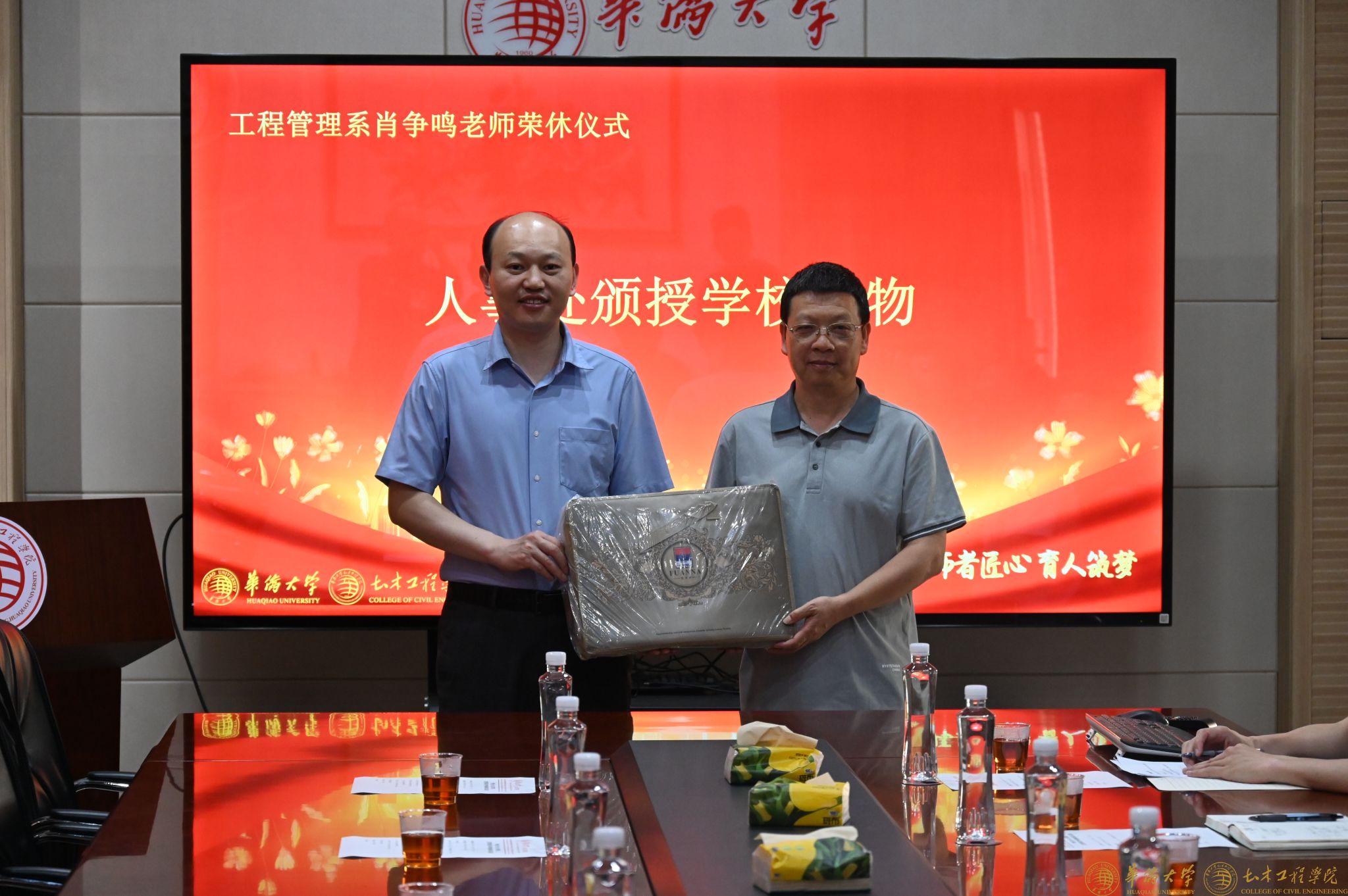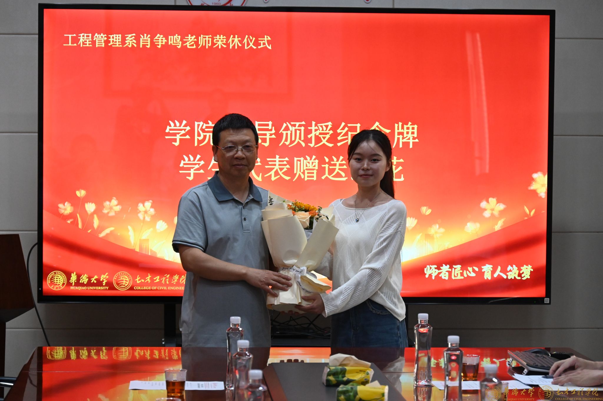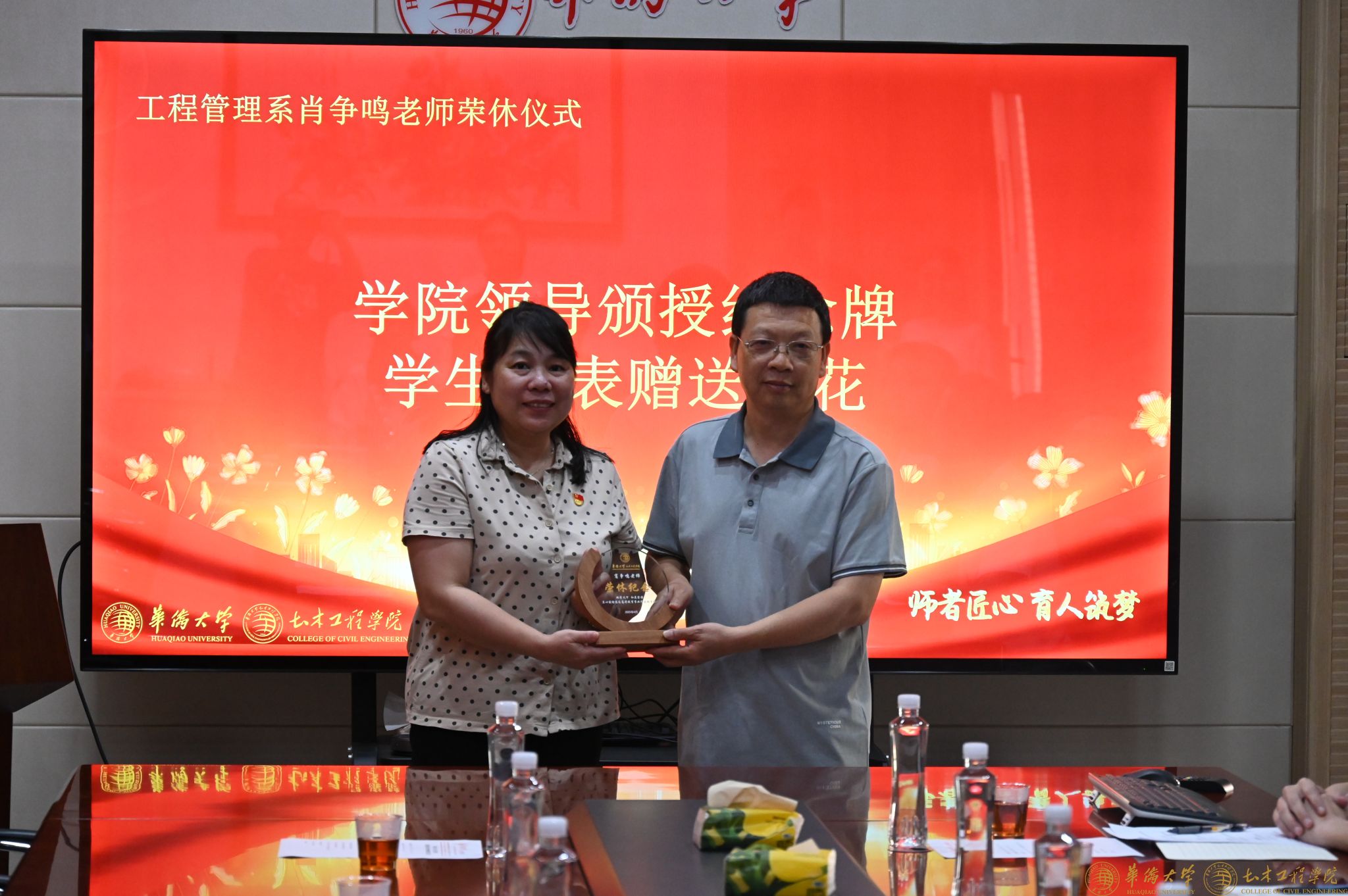 仪式上,李海锋宣读了学校退休文件,并代表学校向肖争鸣老师赠送慰问品。陈雪琴代表学院感恩肖争鸣老师多年来对学院的辛勤付出,向肖老师颁赠荣休纪念奖牌,并表示,肖老师立足三尺讲台乐观积极,在教学改革、科创育人等方面倾注心血,是土木青年教师学习的榜样。希望肖老师在开启人生新旅途时能继续关心和支持学院的事业发展。